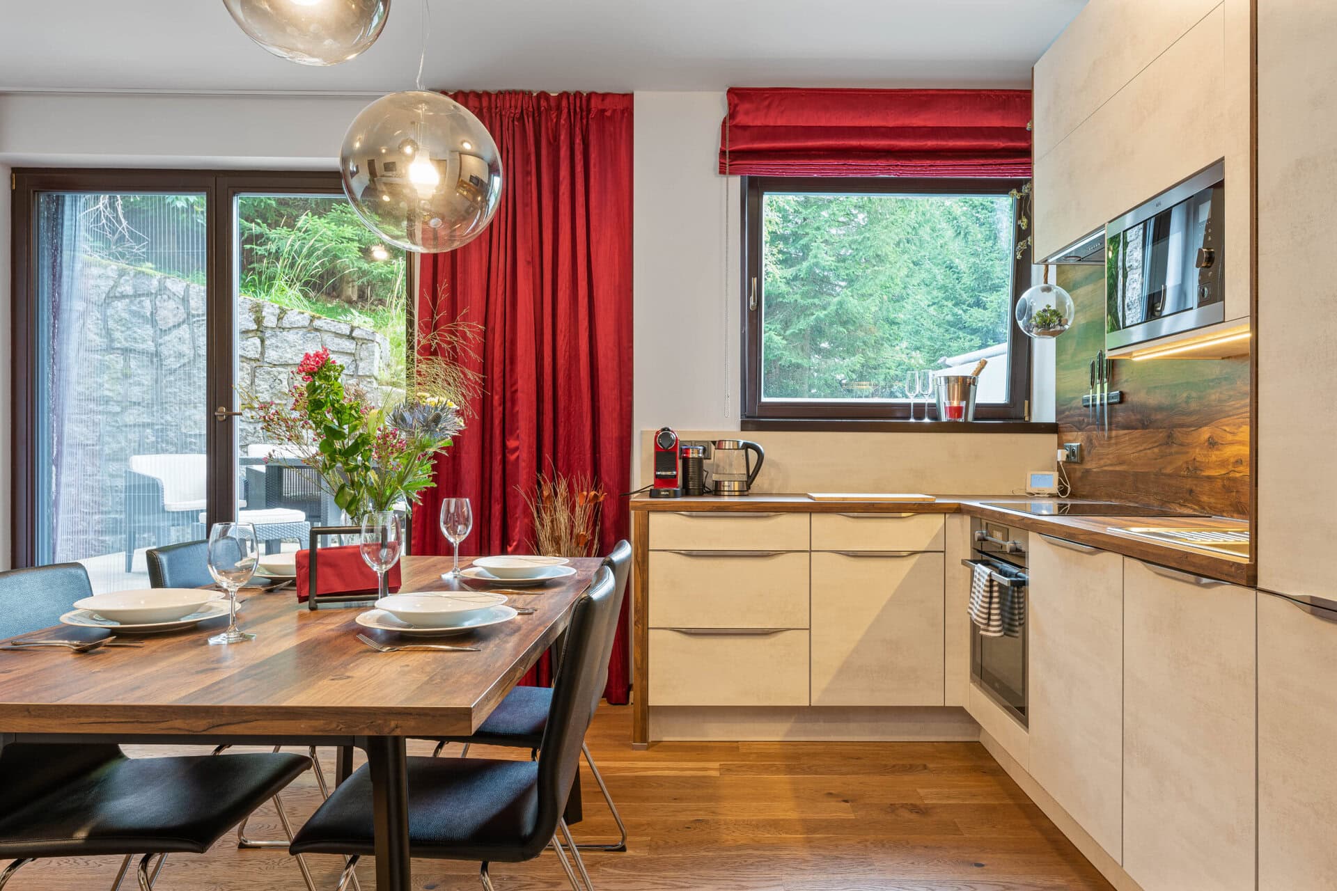 Obývací pokoj s kuchyňským koutem a jídelní částí Samostatná ložnice Koupelna se sprchovým koutem a WC Vstupní chodba s úložným prostorem Terasa (20 m²) s privátní vířivkou a posezením Sklepní kóje – ideální pro lyže nebo kola Venkovní parkovací stání přímo u domu