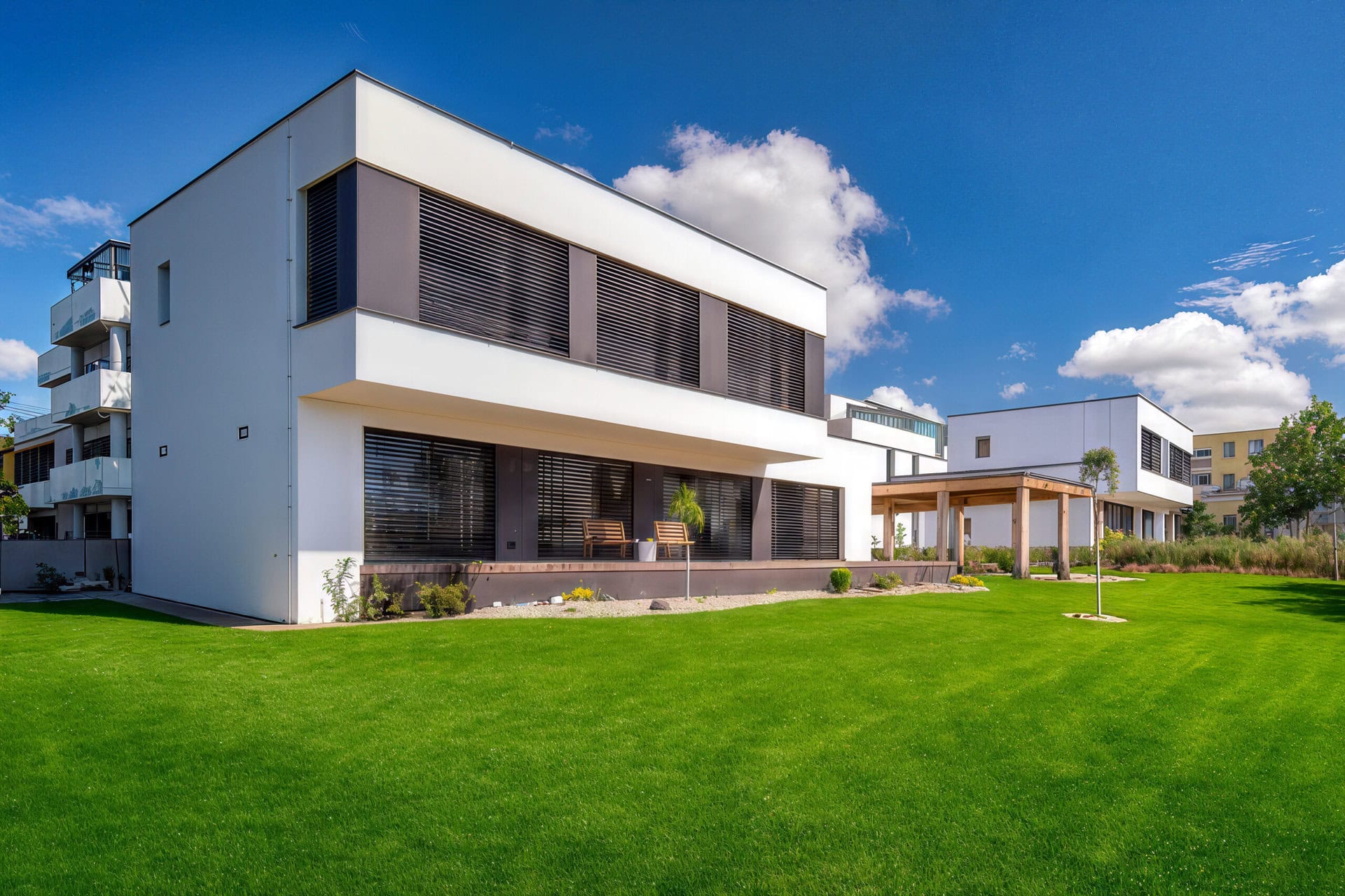 Promyšlená dispozice 5+kk zahrnuje velký, z části prosklený obývací pokoj s kuchyňským koutem, ze kterého se přímo dostanete bezprahovým HS-portálem na terasu. Celkem 4 ložnice zajistí komfortní bydlení i větší rodině, přičemž hlavní ložnice má vlastní koupelnu a prostor pro šatnu. V domě jsou navíc celkem 3 koupelny, z toho 2 privátní u ložnic, takže každému členu rodiny poskytují dokonalý komfort a soukromí.