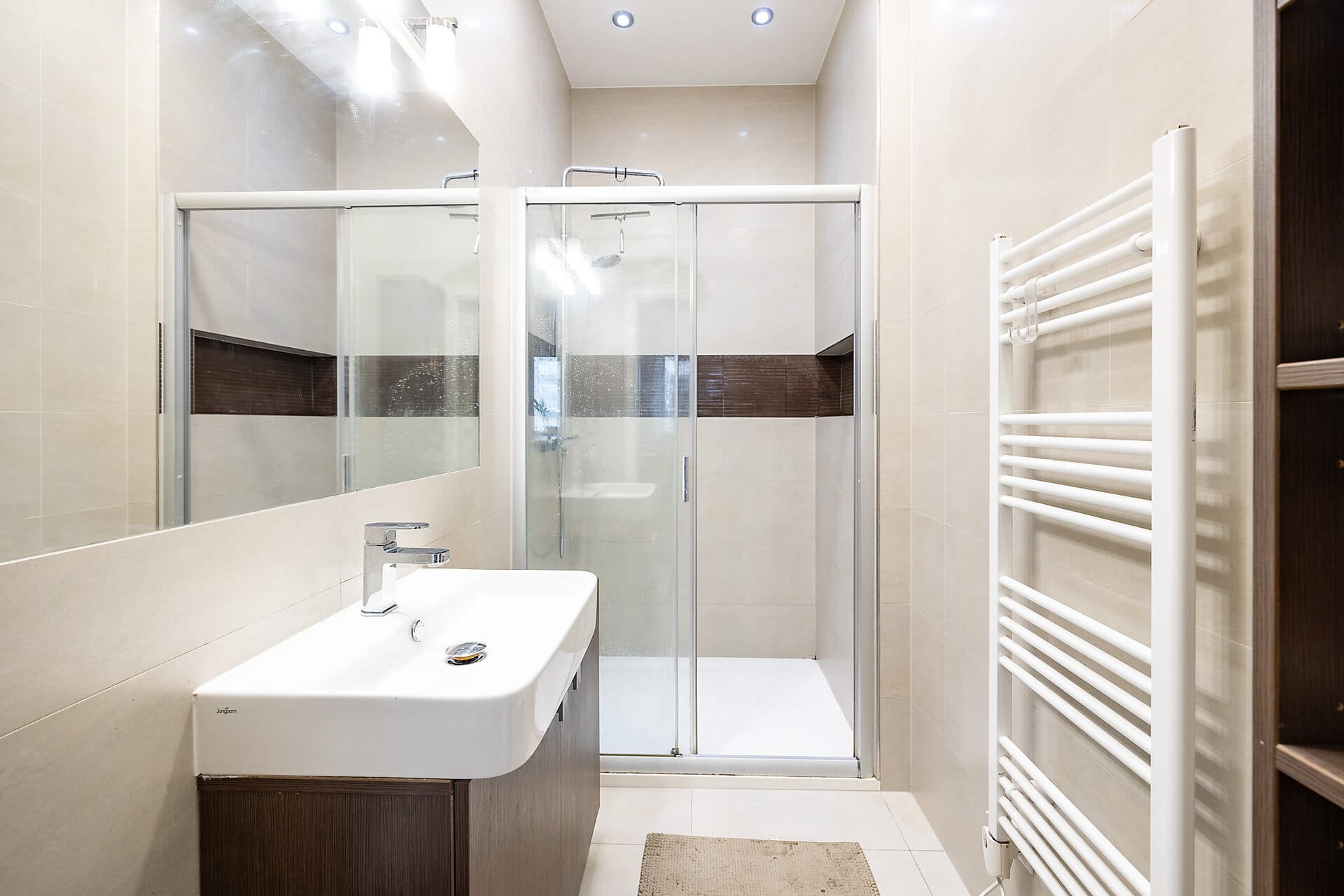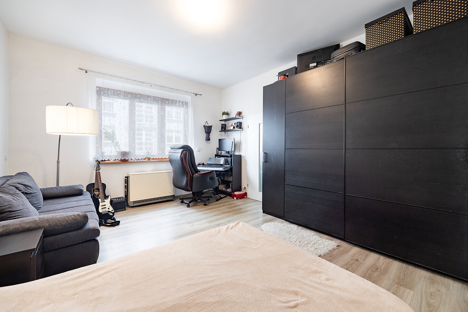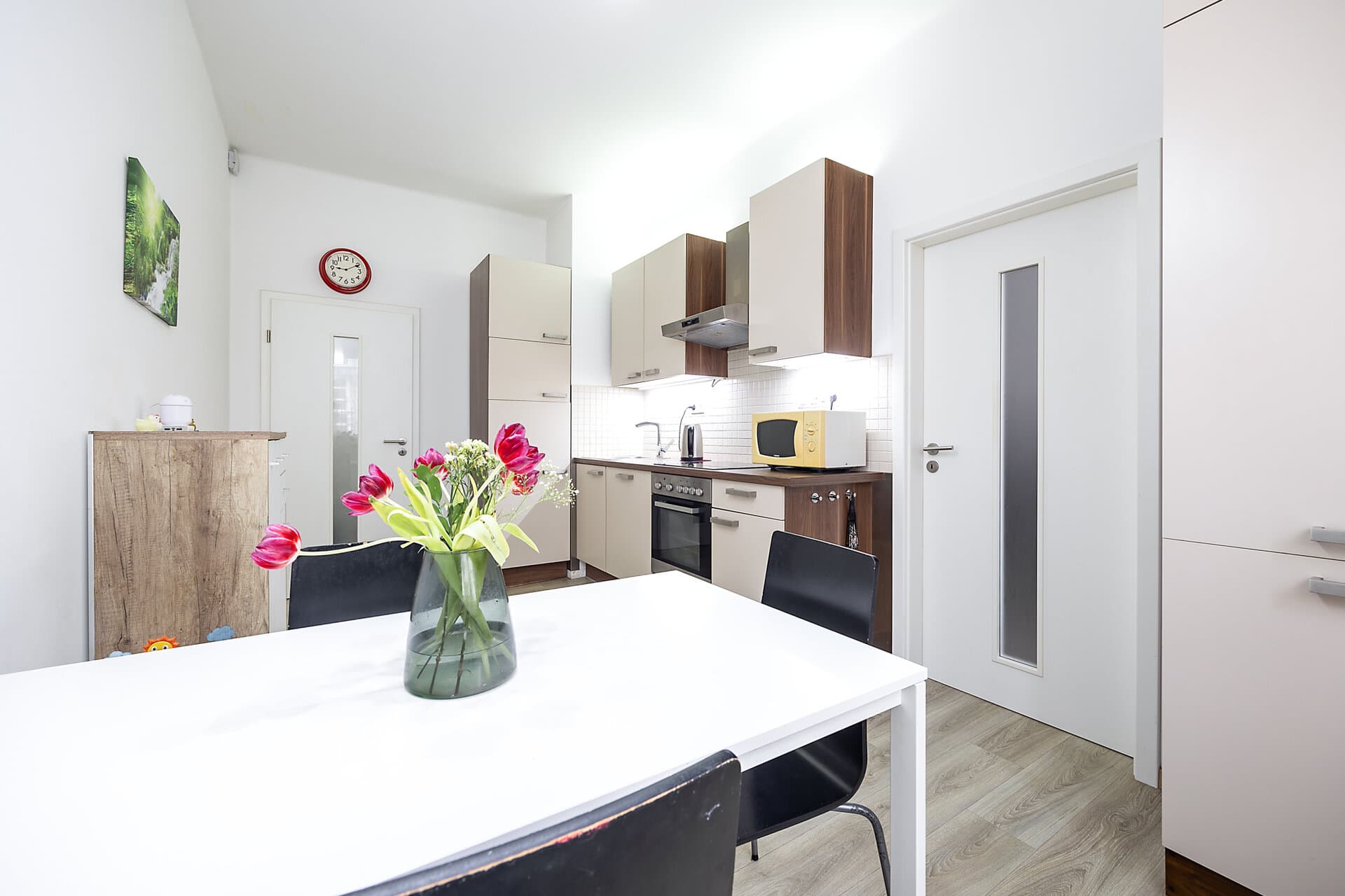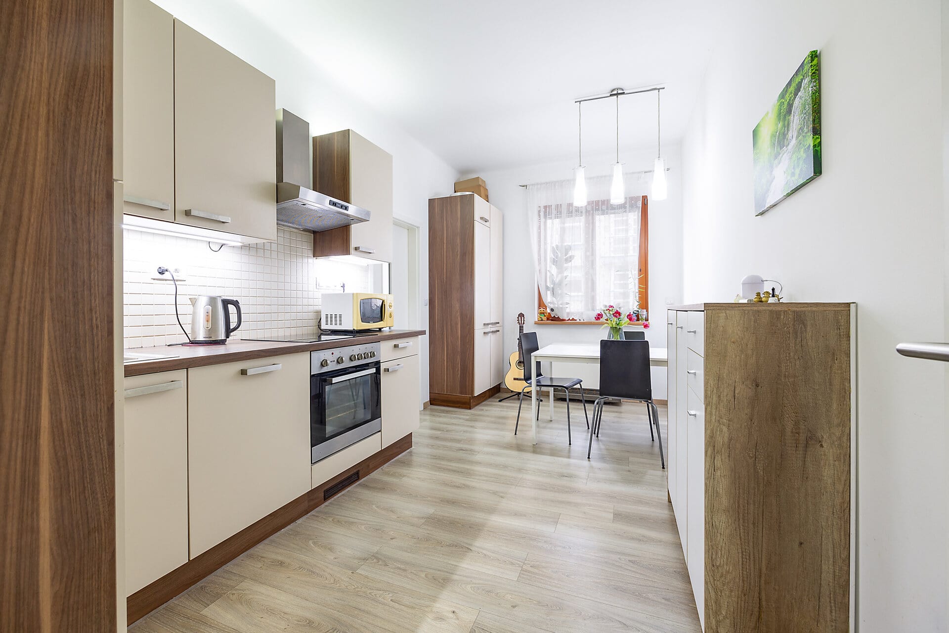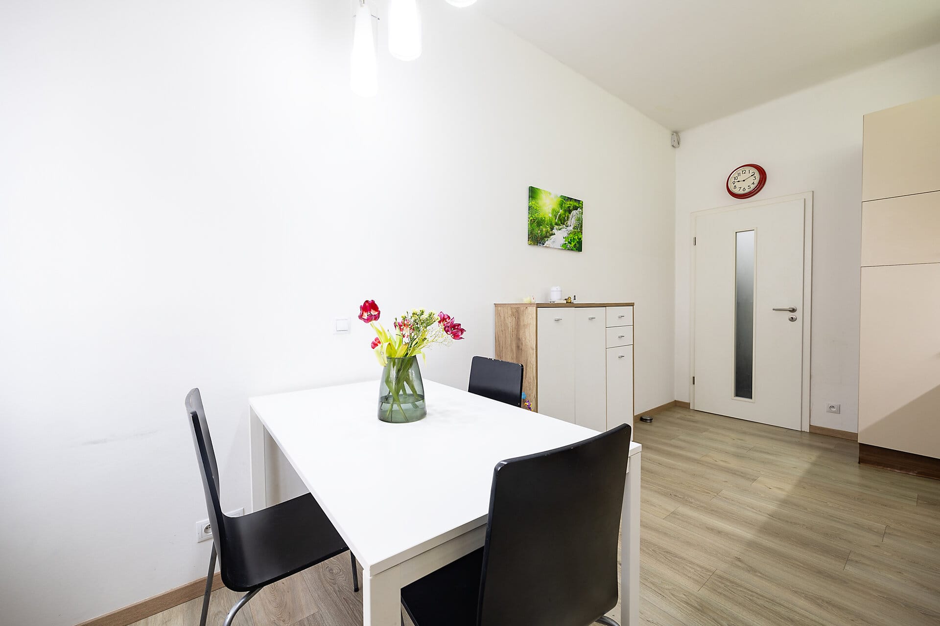 Byt je kompletně zařízený s důrazem na detail a funkčnost, nabízí plně vybavenou kuchyň s jídelním prostorem, útulný obývací pokoj sloužící zároveň jako ložnice s přiléhající en-suite koupelnou vybavenou sprchovým koutem, samostatnou toaletu s praktickým technickým zázemím, šatnu a prostornou vstupní chodbu.